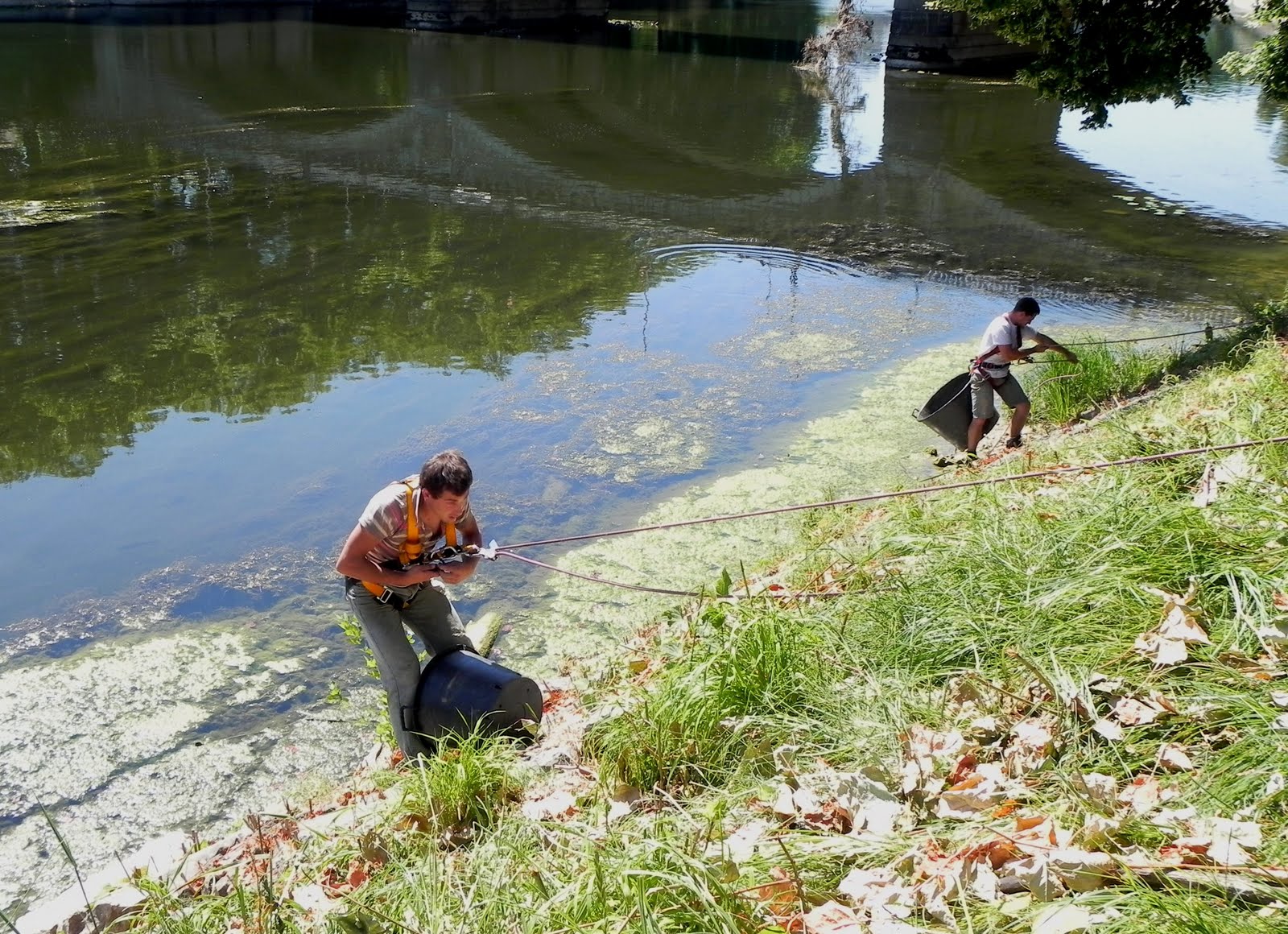 Along the river i came across these 2 workers , according to you what are they doing ?